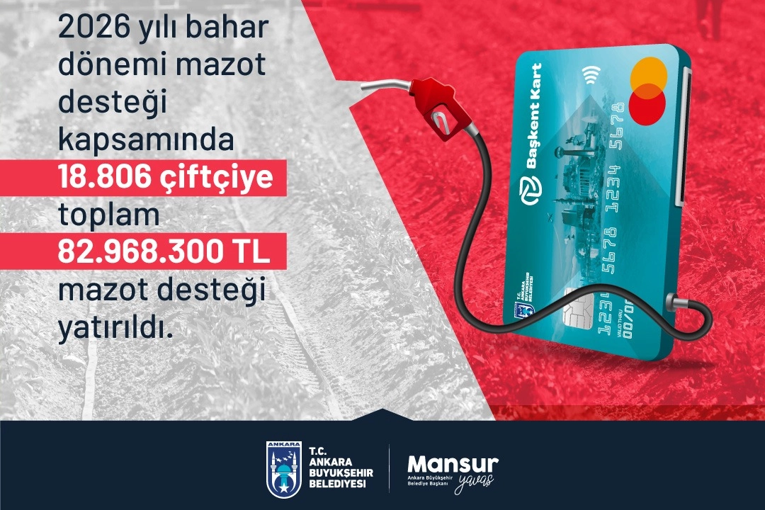 Ankara Büyükşehir Belediyesi, Ramazan Bayramı öncesinde üreticinin yüzünü güldürdü. 2026 yılı bahar dönemi kapsamında 18 bin 806 çiftçiye toplam 82 milyon 968 bin 300 TL mazot desteği Başkent Kartlara yatırıldı.