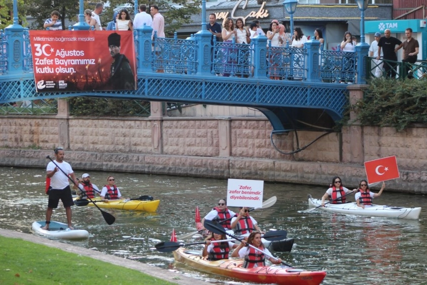 Ellerinde Türk bayraklarıyla Porsuk Çayı üzerinde ilerleyen Eskişehir Büyükşehir Spor Kulübü kano sporcuları, izleyenlere hem duygusal hem de gurur dolu anlar yaşattı. Su üzerindeki bu muhteşem kortej, 30 Ağustos’un ruhunu yansıtan görsel bir şölene dönüştü.