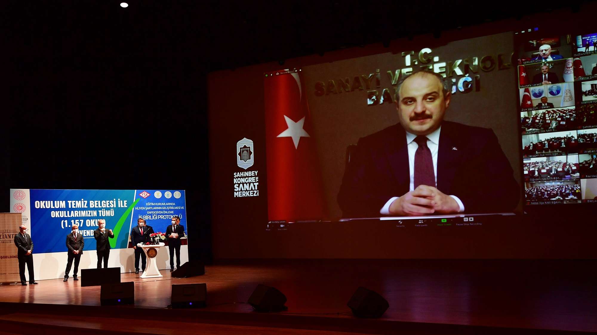 Sanayi ve Teknoloji Bakanı Mustafa Varank, değişen şartlara göre ihtiyaçları hızlıca tespit ettiklerini ve çözüm önerileri geliştirdiklerinin altını çizerek, “Bu sayede de pek çok vizyoner uygulamayı zaman kaybetmeksizin hayata geçirdik. Sanayi kuruluşlarımız için ‘COVİD-19 Hijyen, Enfeksiyon Önleme ve Kontrol Kılavuzu’ nu yayımladık. Kılavuzda yer alan standartları sağlayan ve süreçlerini buna uygun yürüten işletmeleri bize başvurmaları halinde denetliyoruz. İki bakanlığımız iş birliği içinde çalıştı ve eğitim kurumlarına yönelik bir kılavuz hazırladık. Kılavuzda okula girişte hangi kontrollerin yapılacağı, sınıflarda sıra dizilimi ve yerleşim planı detayları, havalandırmanın nasıl sağlanacağı, şüpheli bir durumla karşılaşıldığında, uygun alanın belirlenip ilgili kişilerin izole edilmesi gibi farklı konularda kuralları belirledik. Servisler, derslikler, oyun alanları, laboratuvarlar, öğretmen odaları ve yemekhaneler gibi tüm yerlerde hijyenik koşulların sağlanıp planlı olarak sürdürülmesini amaçladık. Gaziantep işte burada büyük bir başarıya imza attı, biz de bu başarıyı rol model olsun diye tüm Türkiye’ye duyurmak istedik. Bu kayda değer başarıda, takım ruhunun payı gerçekten çok büyük. Okulum Temiz Belgesi sayesinde çocuklarımız hijyen şartları en üst seviyeye taşınmış ve gerekli tedbirleri alınmış ortamlarda eğitim hayatlarına devam ediyorlar” ifadelerini kullandı.