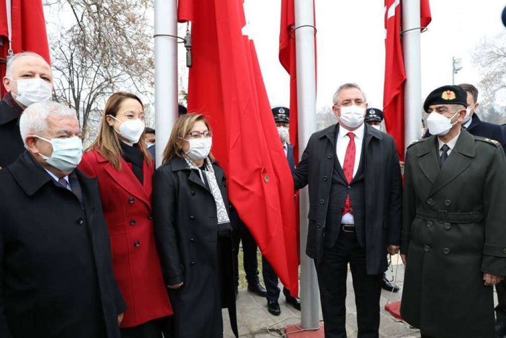 GAZİANTEP (İGFA) - Gaziantep'te Atatürk Anıtı'na çelenklerin bırakılmasıyla başlayan törende, Türkiye Büyük Millet Meclisi (TBMM) tarafından Gaziantep'e verilen İstiklal Madalyası, Büyükşehir Belediye Başkanı Fatma Şahin ve protokol üyeleri tarafından Türk bayrağına takıldı.