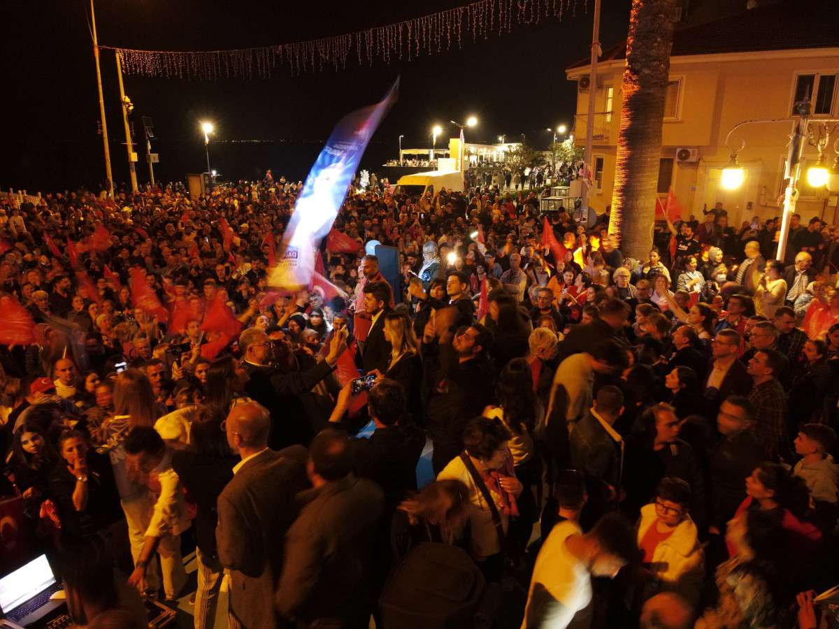 Yeni belediye başkanlarını selamlamak için geç saatlerde Mütareke Meydanı’nı dolduran yüzlerce Mudanyalı, Türk bayrakları ve CHP bayraklarıyla meydanı adeta kırmızıya boyadı.